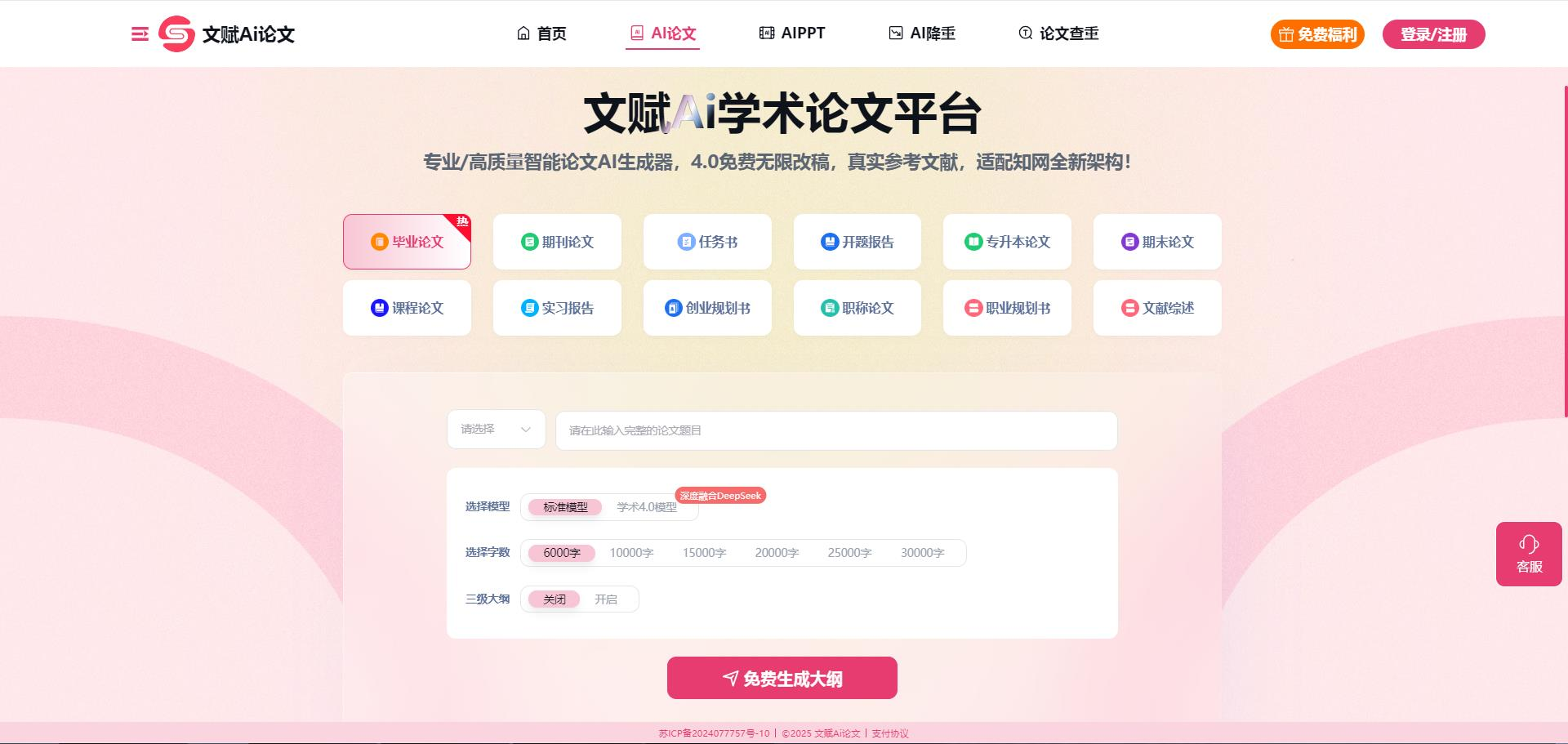 文賦Ai論文平臺,只要輸入標題就能夠快速自動生成論文大綱、論文正文AI寫論文快速高效,從選題到完稿一鍵完成自動查重效率非常高 自動降低AIGC率 提供文獻綜述、中英文摘要、致謝模板 提供多篇致謝模板,隨機切換