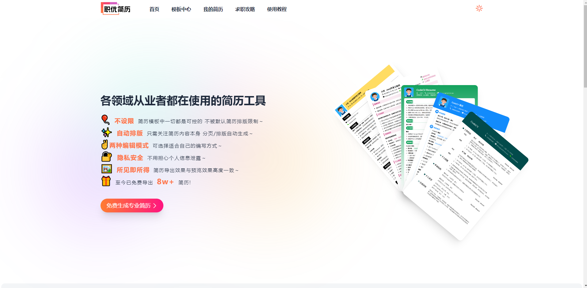 職達AI是專業的AI簡歷優化平臺,幫助 1,00 萬人直通面試!支持AI一鍵生成簡歷,簡歷打分、簡歷優化,模擬面試等,幫助用戶快速制作專業簡歷,提高面試機會。還提供簡歷和職場攻略。幫你在競爭激烈的求職市場中脫穎而出!