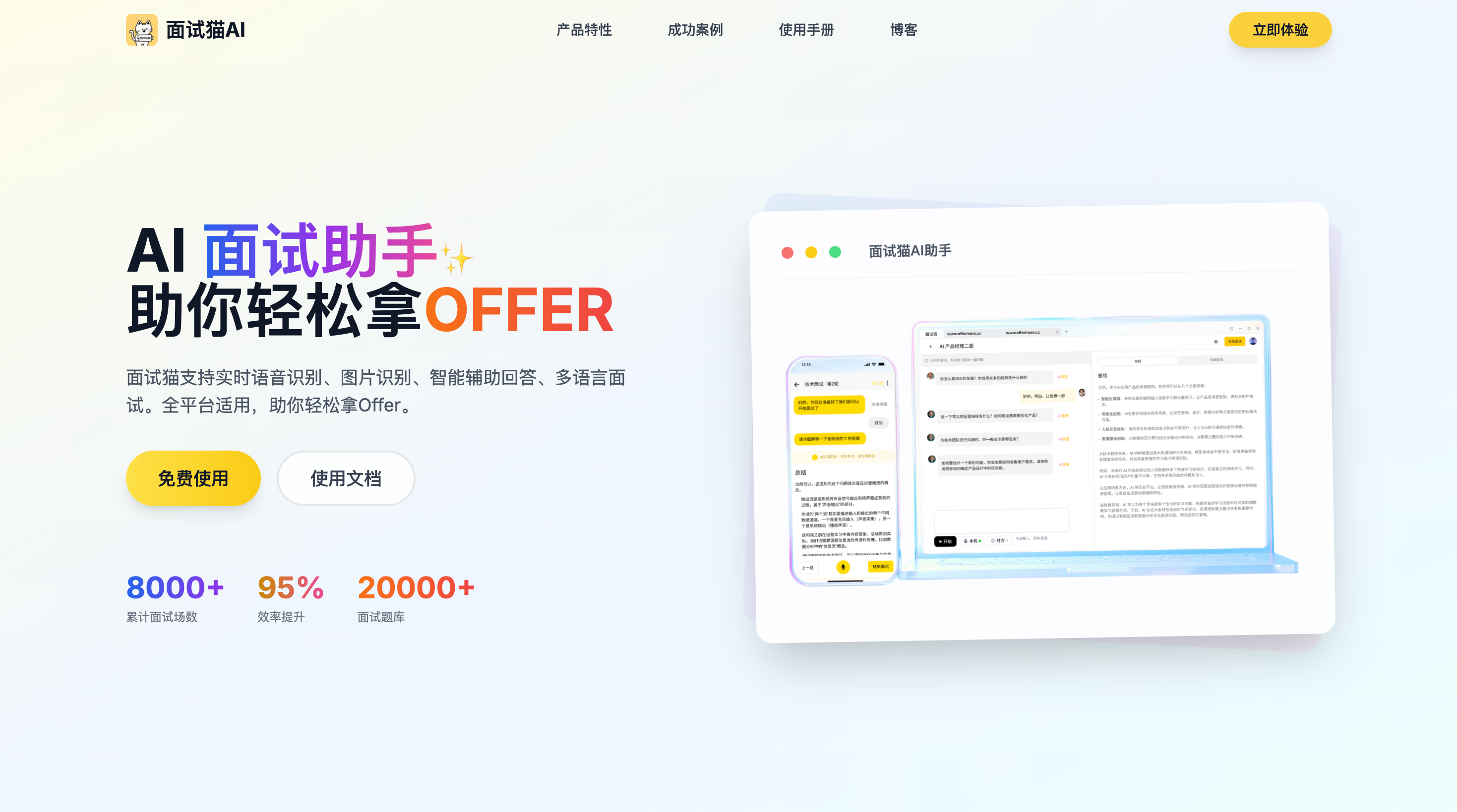 面試貓是一款A(yù)I面試助手,在線面試神器,支持中文、英文在線面試,AI實時答案生成,助你輕松拿Offer。